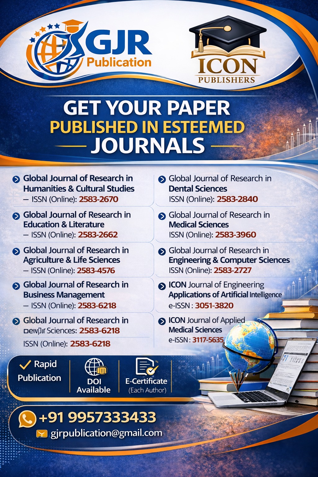 Please kindly see the attached poster for making publications in the journals of GJR Publication & ICON Publishers