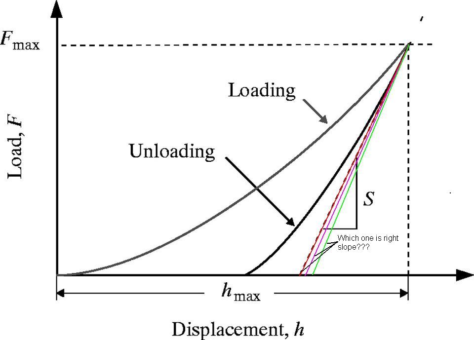 I have with me Load Vs Indentation depth data from my instrument. To apply Oliver and Pharr analysis, I am suppose to use the intial unloading part of the curve to get the slope. But, how one decides from which point one should draw the slope line?? I have refered to many articles, where in they show slope line drawn directly to their unloading curve, but don't describe the actual procedure how do they do it. Also any error is slope will directly influence you measurement and will spread your calculated young's modulus.