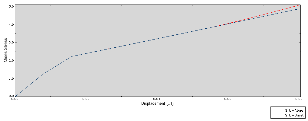 Mises) in field of paper mechanics. I am currently testing my UMAT against Abaqus implemented model on single plain strain element, fixed on one face and loaded with prescribed displacement on one node. So far my UMAT correctly predicts elastic behavior on both isotropic and orthotropic materials. I've encountered problem with plasticity (as early as on Mises phase testing). Routine seems to correctly predict plastic behavior until some threshold level of strain (displacement), beyond that point Abaqus/UMAT results diverge. I figured out that this means that base algorithm is working well (I compared results of elastic predictor-plastic corrector scheme on debug level with other available routines) but there seem to be some kind of bug. I suspect that it may be cause of bad performance on finite-strains but I don't know how to include them. I've done some testing on Anisotropic Elasticity+Hill Criterion but results seem to diverge from the very beginning (well that could be result of change in orientation material matrix while in UMAT it is constantly the