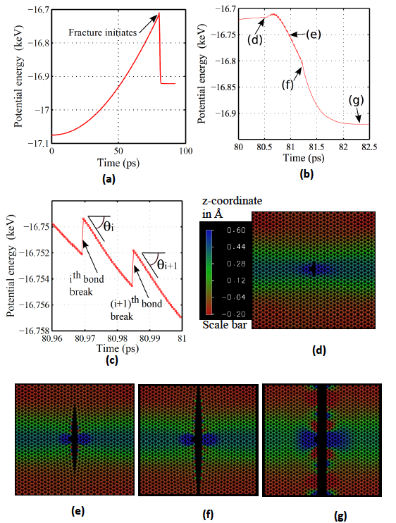 In our recent paper, atomistic and continuum modelling of temperature-dependent fracture of graphene, we directly calculate J integral using the data obtained from molecular dynamics simulations. Fig. 1 outlines the calculation procedure of JIC. Fig. 1(a) shows the changes in potential energy with time (or applied strain) in an armchair graphene sheet with a size of 7.6 nm × 7.6 nm. A crack, length of ~0.7 nm, is placed in the centre of the sheet. Periodic boundary conditions are used along in plane directions. Simulation temperature is 1 K, and strain rate is 0.001 ps-1. Fig 1(b) shows the variation in potential energy during the crack propagation. It can be seen that the potential energy increases just after the crack starts to propagate (around point d). This is due to the chemical potential energy release from carbon-carbon bond breaking overcomes the strain energy release by crack propagation. As more bonds break, the strain energy release due to crack propagation starts to govern the total strain energy release. The crack propagation at various stages (marked as d to g in Fig. 1(b)) is shown in Fig. 1(d) to Fig. 1(g). The figures show that the crack propagates symmetrically. The out of plane deformation of the sheet, as shown in the video 1, prevails.
