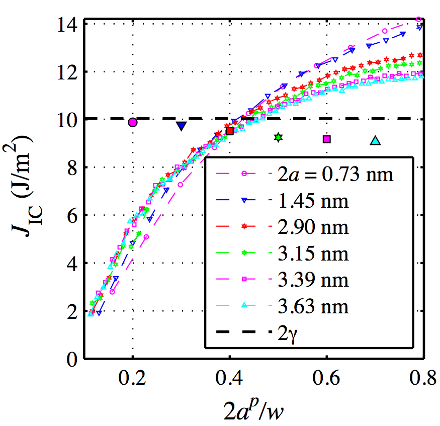 The slope of the piece wise continuous curves in Fig 1(c) is proportional to the critical value of J integral (JIC). Figure 2 shows the variation of JIC with the propagated crack length (2ap), which has been normalized with respect to the width of the sheet (w). The value of 2ap/w is approximately 0.1 when a crack starts to propagate since w is kept around 10 times the initial crack length (2a) to avoid the effects of finiteness. When 2ap/w reaches 1, the periodic cracks start to interact with each other. Therefore Fig. 2 shows the value of JIC up to 0.8 of 2ap/w, where the periodic cracks do not interact with each other for the smallest sheet considered (i.e. w = 7.6 nm).