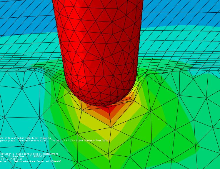Basically I am trying to simulate an indentation experiment on a biological tissue, with glass capillary as the tool for indentation. However, the tip of the capillary is very small compared to the actual size of the tissue, i.e. diameter of the capillary tip is ~0.7cm, the diameter of the tissue under indentation is ~50cm and the length of the tissue (modelling the tissue as a cylinder now) is ~500cm. The real experiment shows that the indentation can easily go to 16cm with NO penetration. However, building a model to simulate this indentation has been a headache for a past few months. Here are the approaches I have tried until now: