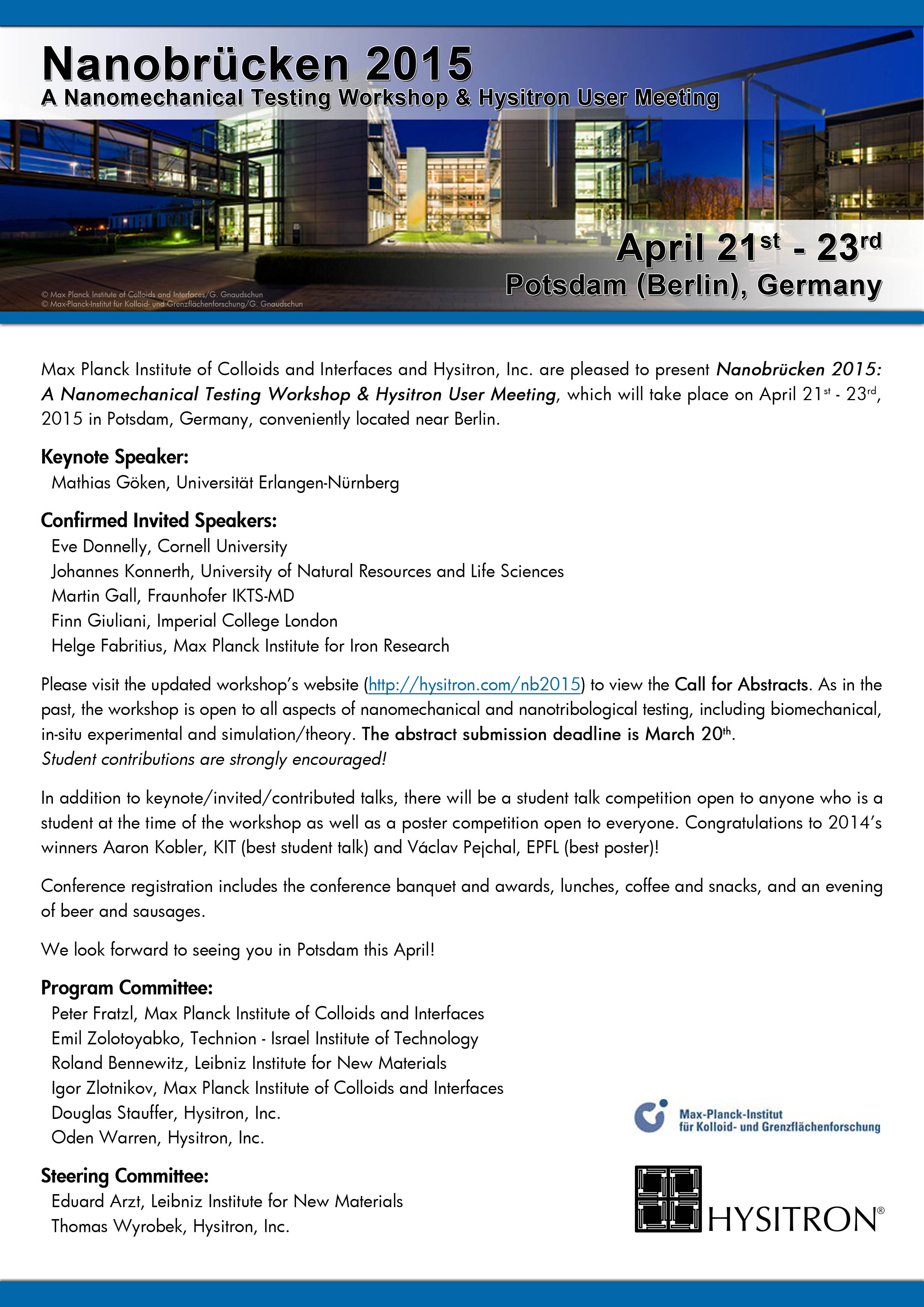 Max Planck Institute of Colloids and Interfaces and Hysitron, Inc. are pleased to present Nanobrücken 2015: A Nanomechanical Testing Workshop & Hysitron User Meeting, which will take place on April 21-23, 2015 in Potsdam, Germany. Nanobrücken 2015 is the fifth edition of the now-annual Nanobrücken workshop series, having been hosted in both Saarbrücken and Dresden.