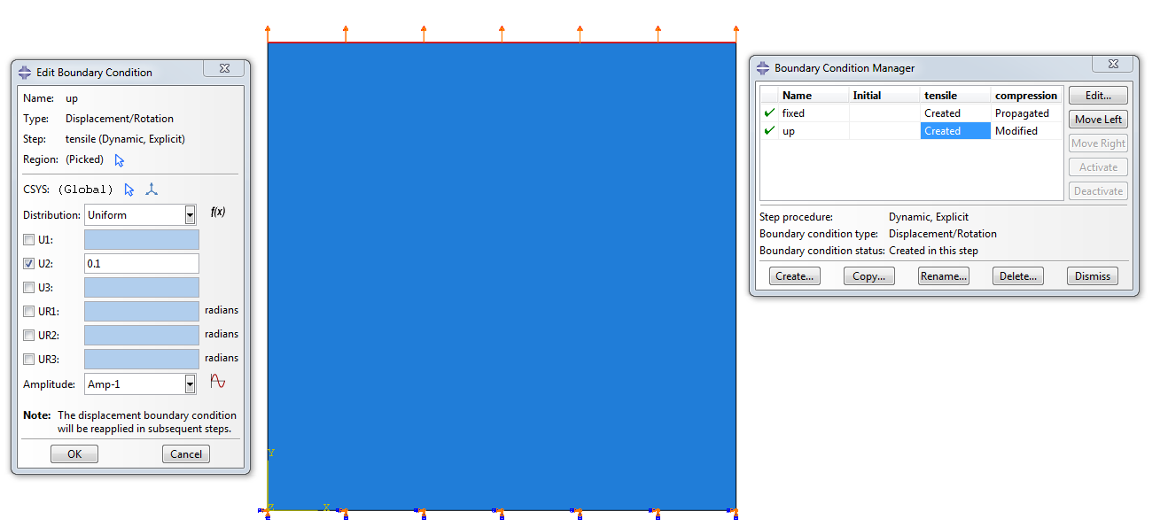 I am newbie on ABAQUS simulation. I try to silumate a basic problem: tensile test an unit square Aluminum sheet by Shell S4R element. I used displacement condition where one edge is fixed and the opposite one is move up 10% of the edge length within 1s. For more detailly information, please see Fig. 1.