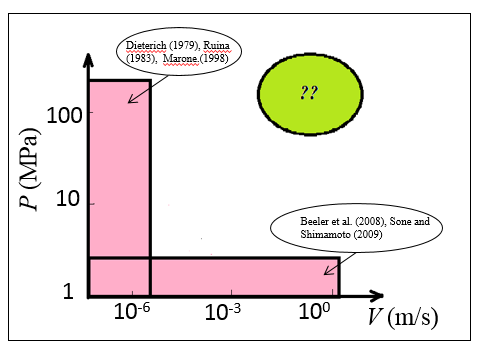 2. Determination of the friction law governing fault dynamics: Current experimental techniques are capable of measuring rock/granular friction at either low strain rates and a wide range of pressures [Dieterich, 1979; Ruina, 1983] or at low pressures and a wide range of velocities [e.g. Beeler et al., 2008l Sone and Shimamoto, 2009]. However, a typical crustal earthquake nucleates at a depth where the  normal stress is of the order of hundreds of Migapascals and the slip during the event will accumulate at a rate of few meters per second (green circle in the opposite figure).  These conditions remain to be challenging to reproduce experimentally. Thus, theoretical models are required to fill this gap.