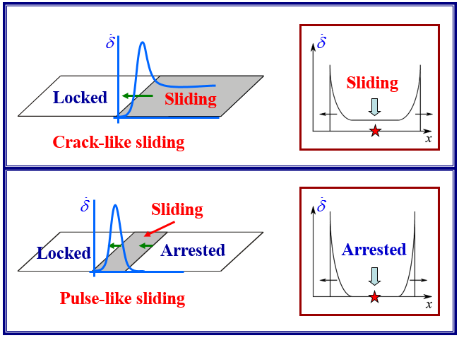Propagation: Earthquakes may propagate in either one of two modes: An expanding crack-like mode or a compact Pulse-like mode. In the crack-like case, each point on the fault continues to slip until the earthquake reaches a strong heterogeneity causing its arrest. Once this happens, arrest waves are reflected back from the termination points causing the slip in the interior of the crack to stop. Thus, each point on the fault surface slips for a period of time comparable to the overall earthquake duration. On the other hand, it may happen that points behind the rupture front cease to slip shortly after the passage of the rupture tip [Freund, 1979; Heaton, 1990; Zheng and Rice, 1998]. This is known as the slip pulse mode since the rupture in this case advances through a compacton of slip (similar to a soliton) rather than the continuously expanding crack. Understanding the conditions under which slip pulse form and their dynamics is still an area of active research. It is natural to contrast short rise time for slip in pulse like ruptures with dislocation dynamics. An interesting recent paper  from Prof. Acharya’s group  touches on some aspects of this analogy [Zhang et al., 2015: http://faculty.ce.cmu.edu/acharya/files/2013/07/layer_problem_final.pdf]