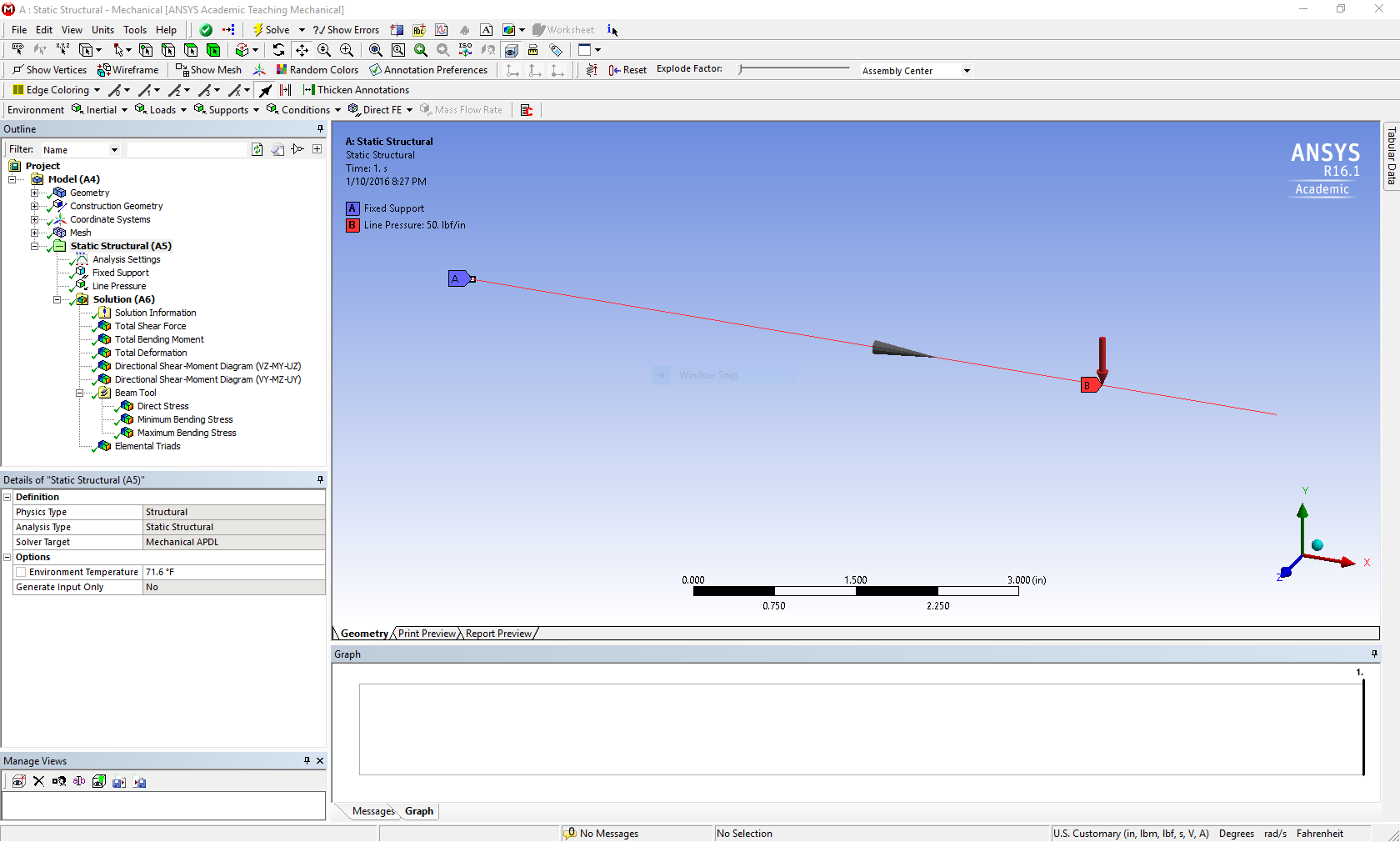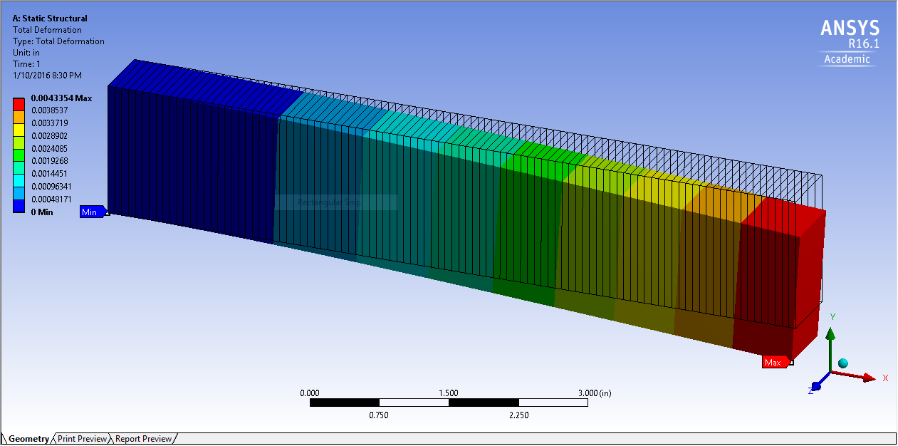 beam_static_structural.jpg : shows a cantilever beam 8 in long under line load -50 lb/in, E=29 msi, cross section 0.75 in wide by 1.5 in tall.