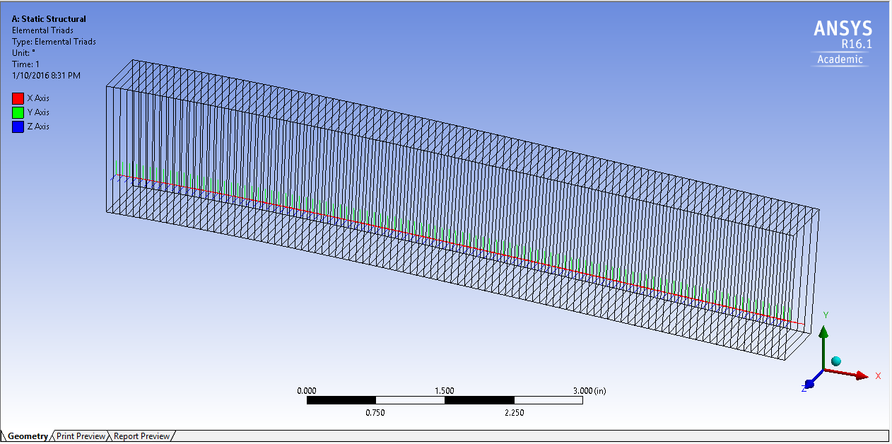 beam_triads.jpg: element triads clearly show cross section coordinates are aligned with global x-y-z coords