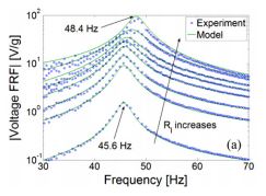 In Erturk and Inman's work, the experimental measurements are repeated for 8 different values of load resistance, i.e. 1, 6.7, 11.8, 22, 33, 47, 100 and 470kΩ as can be seen in attached figure. Each of the resistive loads results in a different voltage ouput as well as different first natural frequency.