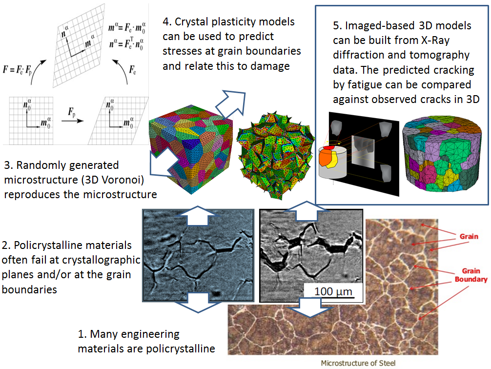 The student will build image-based crystal plasticity models from data obtained by diffraction contrast tomography (DCT) obtained at the European Synchrotron Radiation Facility (ESRF). This would allow validation and further development of the finite element models implemented in Abaqus software. The student will use and further develop ABAQUS user material subroutines (UMAT), user element subrounites (UEL) and post-processing tools. Ultimately, this aims to fill the gap of the lack of understanding of how short fatigue cracks initiate and propagate. During the PhD programme, the student will also benefit from on-going and further collaborations with colleagues at Manchester University, Madrid Materials IMDEA institute and colleagues at Oxford University.