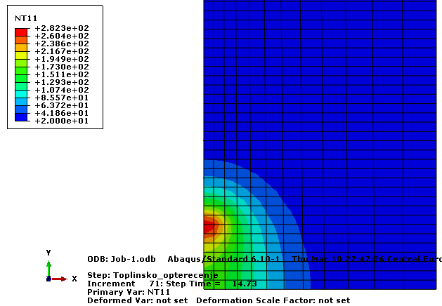 I know that there are some posts about welding simulation with Abaqus and i looked at them already and I couldn't find something similar to my problem. I model a moving heat source with amplitudes and sets in Abaqus/Standard. I define body heat flux loads and give them amplitudes and magnitudes. The model is meshed with DS4 shell elements. The problem is that ater the simulation it is visible (with temperatures visualization) that the heat flux is not inputed linearly in the model. I mean to say that there is no linear movement of the heat source that is typical to welding, although all fluxes are inputed at the specified time. I'm uploading three pictures so you can see what the problem is. Picture with time 14.73 shows one active flux. Picture with time 15.42 shows the time in which active flux shuts down and a new one starts (visible bigger red area, not linearly moving flux). Picture with the time 17.47 shows one active flux after the previous one shuts down. Please help as soon as you can because this is a part of my master thesis and I have limited time.