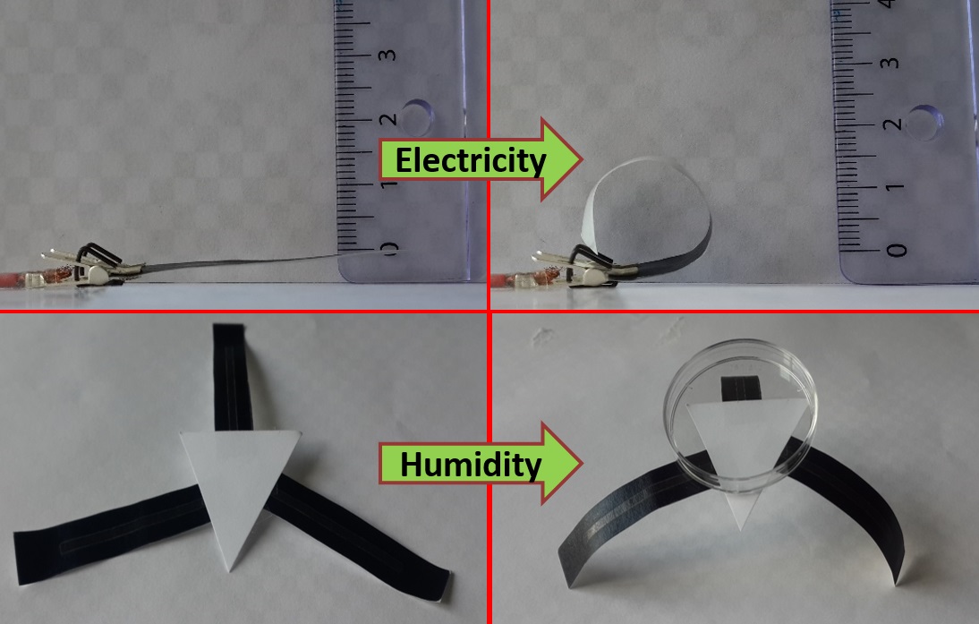Abstract: There is an increasing demand for soft actuators because of their importance in soft robotics, artificial muscles, biomimetic devices, and beyond. However, the development of soft actuators capable of low-voltage operation, powerful actuation, and programmable shape-changing is still challenging. In this work, we propose programmable bilayer actuators that operate based on the large hygroscopic contraction of the copy paper and simultaneously large thermal expansion of the polypropylene film upon increasing the temperature. The electrothermally activated bending actuators can function with low voltages (≤ 8 V), low input electric power per area (P ≤ 0.14 W cm−2), and low temperature changes (≤ 35 °C). They exhibit reversible shape-changing behavior with curvature radii up to 1.07 cm−1 and bending angle of 360°, accompanied by powerful actuation. Besides the electrical activation, they can be powered by humidity or light irradiation. We finally demonstrate the use of our paper actuators as a soft gripper robot and a lightweight paper wing for aerial robotics.