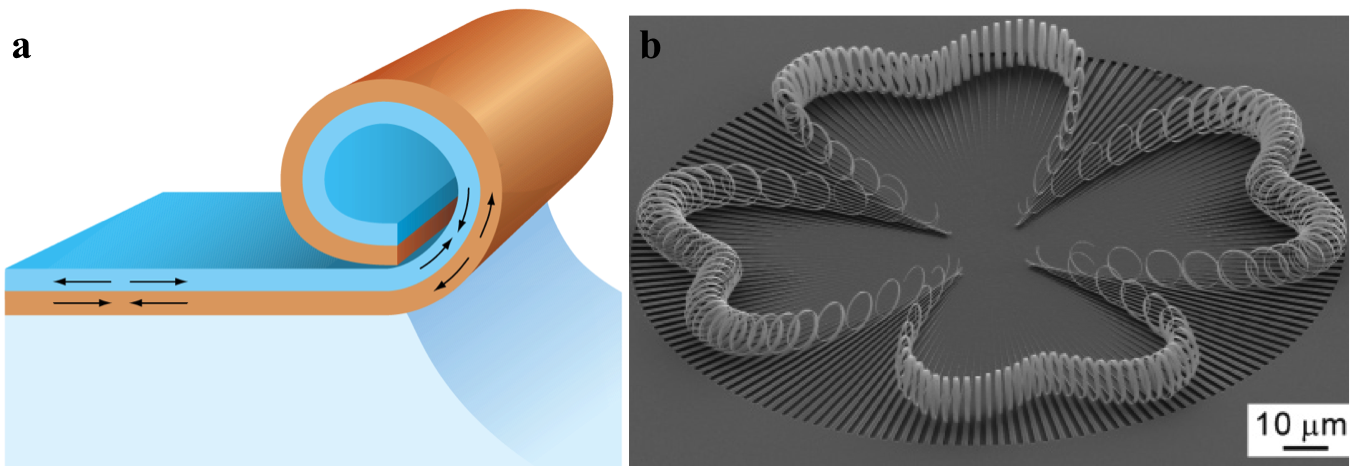 Residual stress in the thin films, when unconstrained, will bend 2D materials and devices into tubes and helices. The residual stress can be from lattice mismatch during the epitaxial growth process, difference in thermal expansion coefficient, or the nonuniform/anisotropic modulus distribution in the materials after post processing.