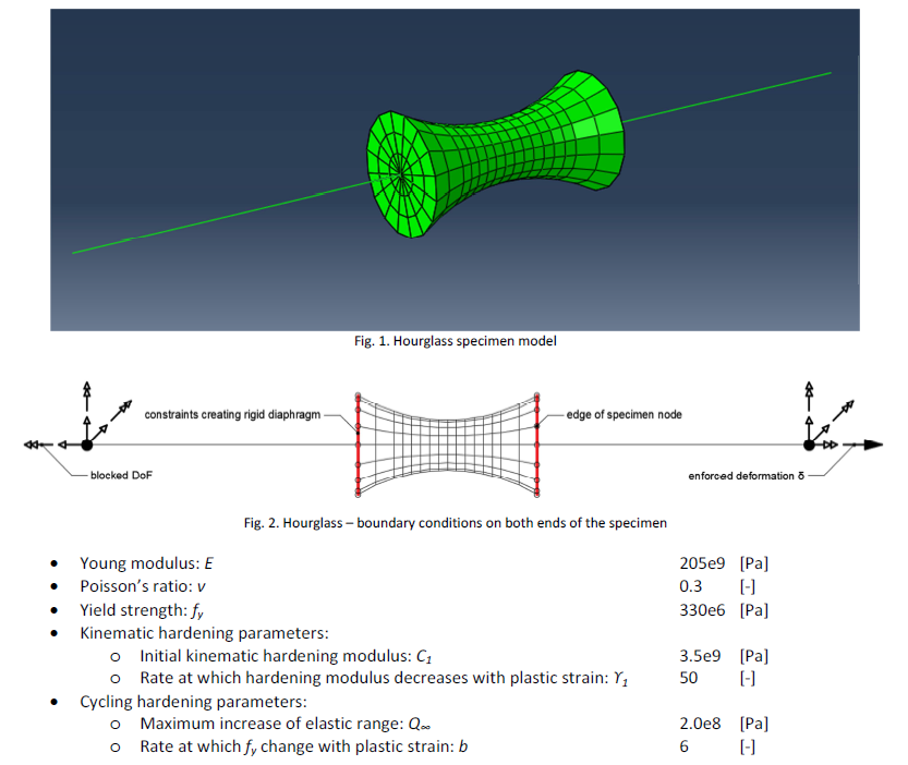 I have recently done a simple hourglass model to check the influence of hardening parameters in Abaqus. The reason was the effects of the parameters' change in bigger models were a bit surprising, therefore I needed to investigate the reason using some simpler model. Please see file 1.