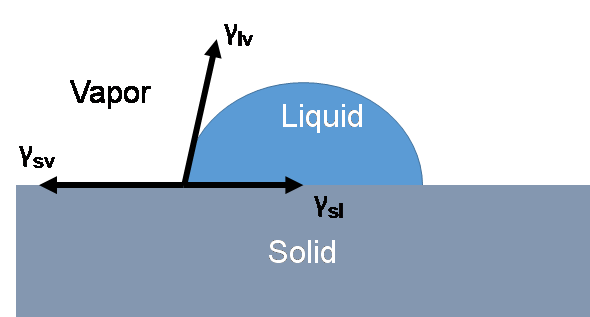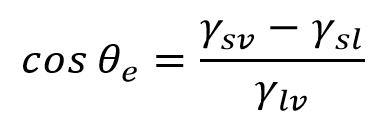 The relation between equilibrium contact angle θe and the surface tensions can be expressed by Young’s equation: