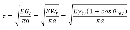 where E is Young’s modulus, Gc is surface energy of the crack and equal to practical work of adhesion Wp, and a is the initial crack length. According to this equation, they conclude that the state of the ice and superhydrophobic surface can affect the crack opening energy. Thus ice adhesion strength relates to not only the receding contact angle, but also the initial crack length. The Cassie wetting state can decrease the shear strength due to the voids between the solid surface and water/ice, which can serve as microcracks (stress concentrators) and increase the initial crack length a. Consequently, some superhydrophobic surfaces can have strong ice adhesion if they do not provide sufficiently large voids at the interface [17].