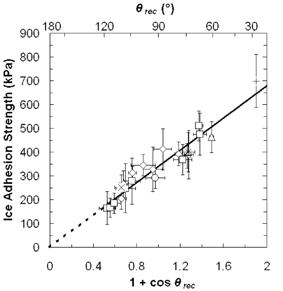 When the liquid water turns into solid ice, the parameters contributing to the adhesion would not change except mechanical adhesion. Hence ice adhesion might also correlate strongly with the receding contact angle. Meuler et al [18,29] investigated the relationships between water wettability and ice adhesion strength on nominally smooth bare and coated steel discs and found that the ice adhesion strength varies nearly linearly with the interaction parameter (1 + cos θrec) that scales with the practical work of adhesion for liquid water (Figure 3).