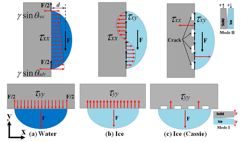 Nosonovsky and Hejazi [17,19] studied the ice adhesion on superhydrophobic surfaces, assumed that ice detaches from the solid surface through fracture, which is different from the dewetting mechanism (Figure 4). Fracture may occur either within the ice itself when the ice adhesion strength is strong or at the substrate-ice interface if cracks are present. There are two types of cracks in de-icing, termed mode I and mode II, which correspond to normal and shear loading respectively. The failure stress τ can be express as: