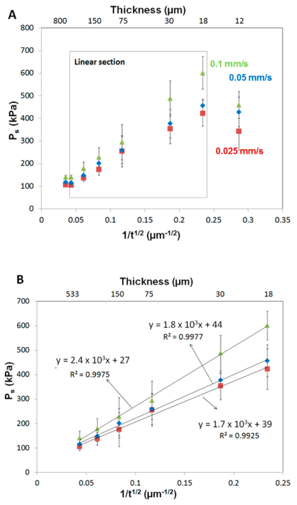 Figure 5 (A) Ice adhesion (Ps, kPa) as a function of 1/t1/2 with probe speeds 0.1, 0.05, and 0.025 mm/s. (B) Trend lines are for the linear section in (A) [22].