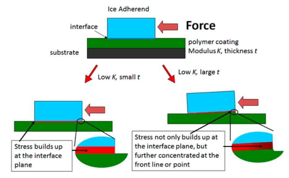 where Wa and E is the work of adhesion and elastic modulus respectively. As shown in Figure 6, the mismatch in modulus leads to stress building up at the interface, and thicker coating facilitates lager vertical displacement in the same modulus. Then the lager displacements will induce adhesion failure on soft surface. This relationship implicated that increasing the mismatch between the coating and ice may result in very low ice adhesion strength.