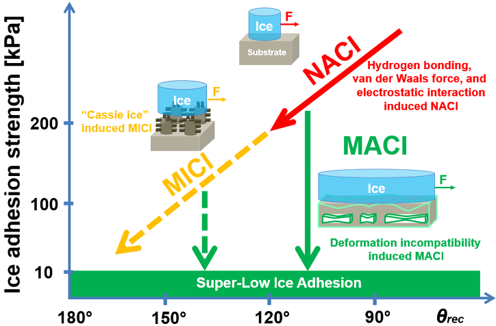 Very exciting and inspiring review! I am very interested in your fantastic work about the macro-crack initiator (MACI) approach. In this approach, you first coated the polydimethylsiloxane film and then introduced some specific sub-structures to the film. Such sub-structure can induce the formation of macroscopic cracks between ice and film due to deformation incapability. I have two following questions about details of sub-structures,
