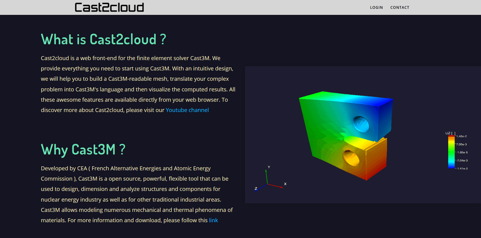 We are pleased to present Cast2cloud (http://cast2cloud.com), the first and only web-based platform for interacting with Cast3M. The latter is a finite element software developed by the French Alternative Energies and Atomic Energy Commission (CEA) for mechanical and thermal simulations. It is available free of charge for teaching and research. For further information, please refer to http://www-cast3m.cea.fr/.
