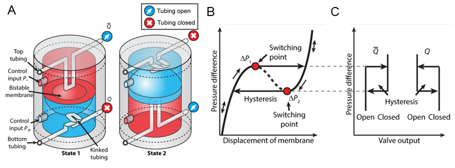 Figure 1: The soft, bistable valve. (A) The structure of the valve. (B) The pressure volume curve exhibits a snap-through instability. (C) The output of the tubes as function of the pressure difference across the membrane. Figure adapted from [8].