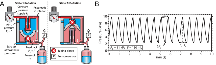 Figure 3: The soft valve as an oscillator. (A) Structure of the oscillator. The output is connected to the bottom chamber to create a fluidic feedback circuit, which excites pressure oscillations. (B) Example of pressure oscillations controlled by the valve. Figure adapted from [8].
