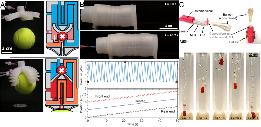 Figure 4. Autonomous soft robots. (A) A soft gripper that closes autonomously upon contact with an object. (B) A soft walker that advances using air from a source of constant pressure. (C) A soft robot that autonomously oscillates between to level of depth in a water tank. (A) and (B) adapted from [8]. (C) adapted from [9].