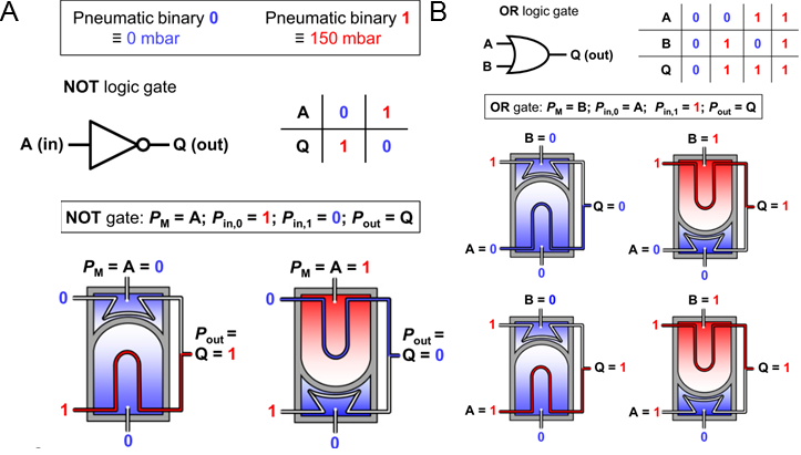 6. Soft logic gates Without modifications the soft valve can act as a logic gate and enable digital logic function [9]. In this case, a pressure above the snap-forward pressure is interpreted as "1", and a pressure below the snap-backward pressure is interpreted as "0". The function of the valve depends on how the chambers and the tubes are connected to external pressure sources. Figure 5A shows a configuration in which the valve acts as a "not" gate. The valve is designed such that the membrane bends upwards when no pressure is applied to the top chamber. The top tube and the bottom chamber are connected to atmosphere ("0"). The bottom tube is connected to an air source of constant pressure, which is interpreted as "1". When no pressure is applied to the top chamber (input "0"), the output of the valve is "1". When a pressure equivalent to "1" is applied to the top chamber, the output switches to "0" (i.e., the valve inverts the input signal). We have also demonstrated an "or" logic gate (Figure 5B), and an "and" logic gate (not shown here). This set of logic gates is functionally complete (i.e., any logic circuit can be build from these basic components) and can therefore serve as the basis for complex logic circuits.