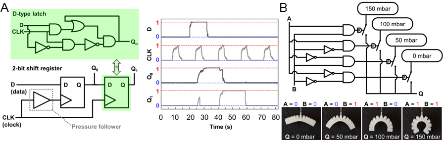 7. Digital, soft logic circuits As described above, the soft valve may be used as a building block for the digital control of soft robots [9]. We have implemented serial-in/parallel-out shift registers that allow the control of multiple actuators with a single control signal and a periodic signal (clock). Figure 6A shows a two-bit shit register that controls two parallel outputs. Every time the clock switches to state "1", the current state of the first output is transferred to the second output, and the currently applied input signal is transferred to the first output. Another circuit that we have implemented is a two-bit digital to analog converter (Figure 6B). The digital to analog converter transforms a two-bit digital input signal into four different levels of output pressure.