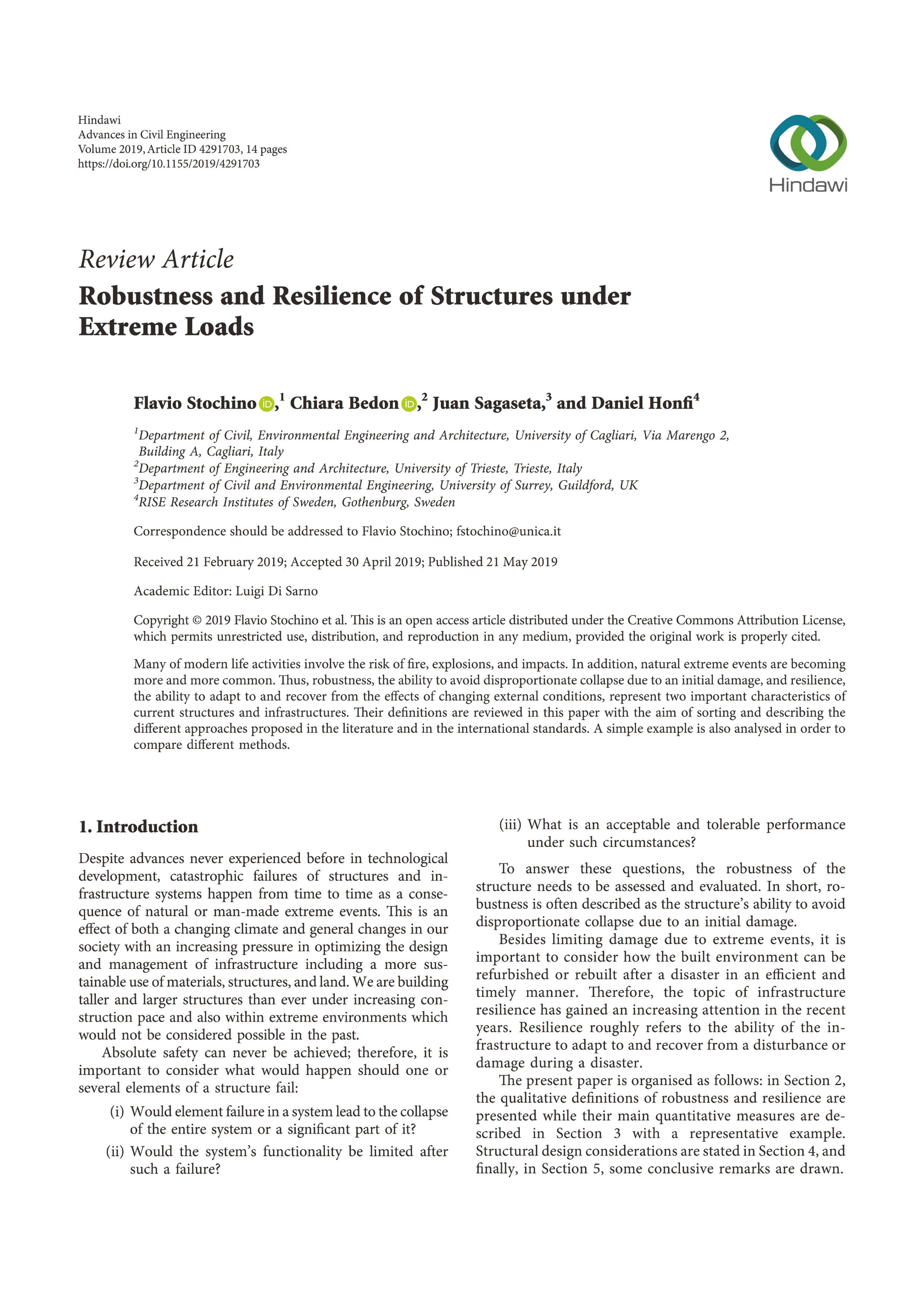 Many of modern life activities involve the risk of fire, explosions, and impacts. In addition, natural extreme events are becoming more and more common. us, robustness, the ability to avoid disproportionate collapse due to an initial damage, and resilience, the ability to adapt to and recover from the effects of changing external conditions, represent two important characteristics of current structures and infrastructures. eir definitions are reviewed in this paper with the aim of sorting and describing the different approaches proposed in the literature and in the international standards. A simple example is also analysed in order to compare different methods.