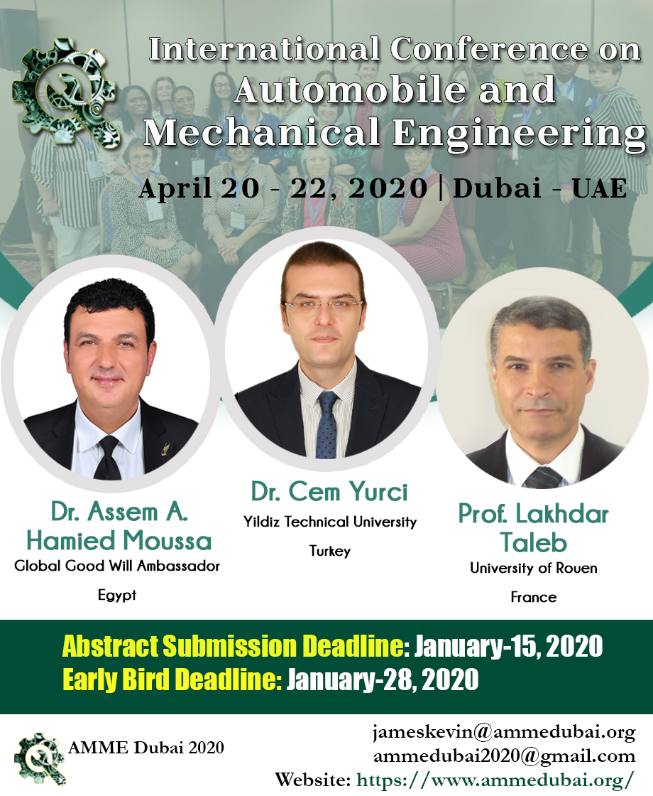 International Conference on Automobile and Mechanical Engineering (AMME Dubai 2020) is going to be held on April 20-22, 2020 in Dubai. AMME Dubai 2020 invites all the Speakers, Poster/Oral Presenters and Delegates to this perfect platform to gain and learn the latest innovations in the field of Automobile and Mechanical Engineering.