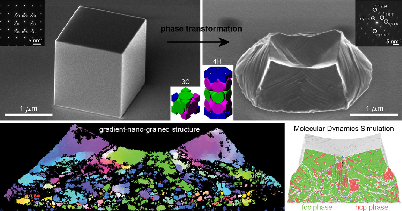The ability to transform the crystal structure of metals in the solid-state enables tailoring their physical, mechanical, electrical, thermal, and optical properties in unprecedented ways. We demonstrate a martensitic phase transformation from a face-centered-cubic (fcc) structure to a hexagonal-close-packed (hcp) structure that occurs in nanosecond timescale in initially near-defect-free single-crystal silver (Ag) microcubes impacted at supersonic velocities. Impact-induced high pressure and high strain rates in Ag microcubes cause impact orientation-dependent extreme micro- and nano-structural transformations. When a microcube is impacted along the [100] crystal symmetry direction, the initial fcc structure transforms into an hcp crystal structure, while impact along the [110] direction does not produce phase transformations, suggesting the predominant role played by the stacking faults generated in the [100] impact. Molecular dynamics simulations at comparable high strain rates reveal the emergence of such stacking faults that coalesce, forming large hcp domains. The formation of hcp phase through the martensitic transformation of fcc Ag shows new potential to dramatically improve material properties of low-stacking-fault energy materials.