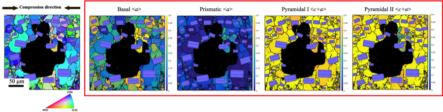 From EBSD, Schmid factors of different slip systems can be calculated from the IPF maps acquired by the method above. Using the same IPF map as an example, as shown in Fig. 3, all the Mg primary slip systems (basal <a>, prismatic <a>, pyramidal I <c+a> and pyramidal II <c+a>) in each grain can be calculated and mapped.