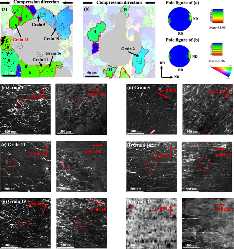Figure 6. (a) and (b) IPF maps of two specially designed TEM foils near the electropolished perforation region from the ND compression 2.6%-deformed AZ31 alloy. The schematic shows the orientations of labeled grains. The black arrows above each figure indicate the compression direction. (c)–(g) Examples of WBDF micrographs in 5 grains reveal their dislocation characters. The grain labels correspond to their locations in the foil in (a) and (b). Red circles are the fiducial markers to mark the identical sites. (h) BF and WBDF micrographs of Grain 13, showing the absence of <c + a> dislocations. (Image adapted from [18])
