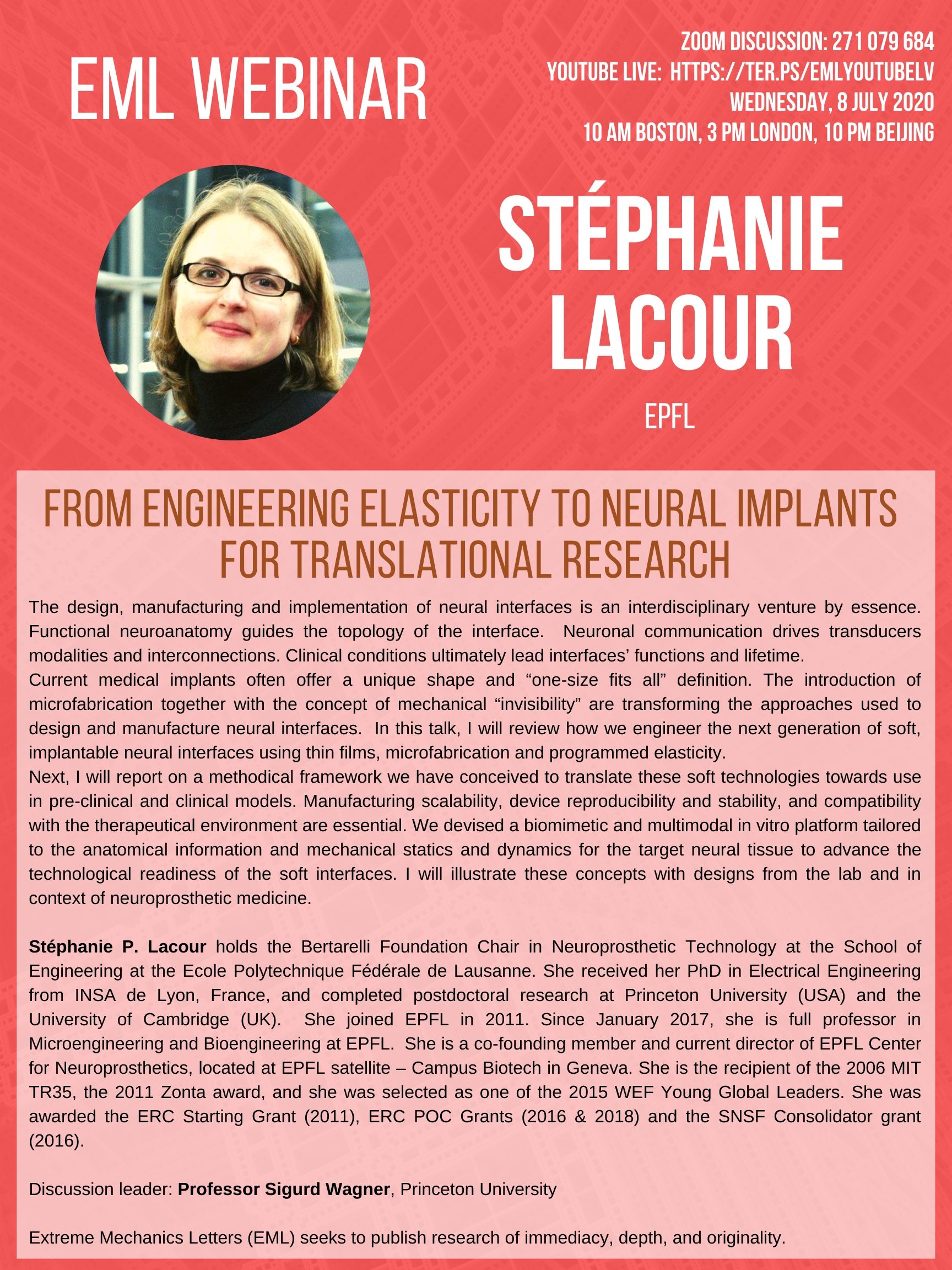 EML Webinar on July 8, 2020 will be given by Prof. Stephanie Lacour at EPFL via Zoom meeting. Discussion leader: Professor Sigurd Wagner, Princeton University
