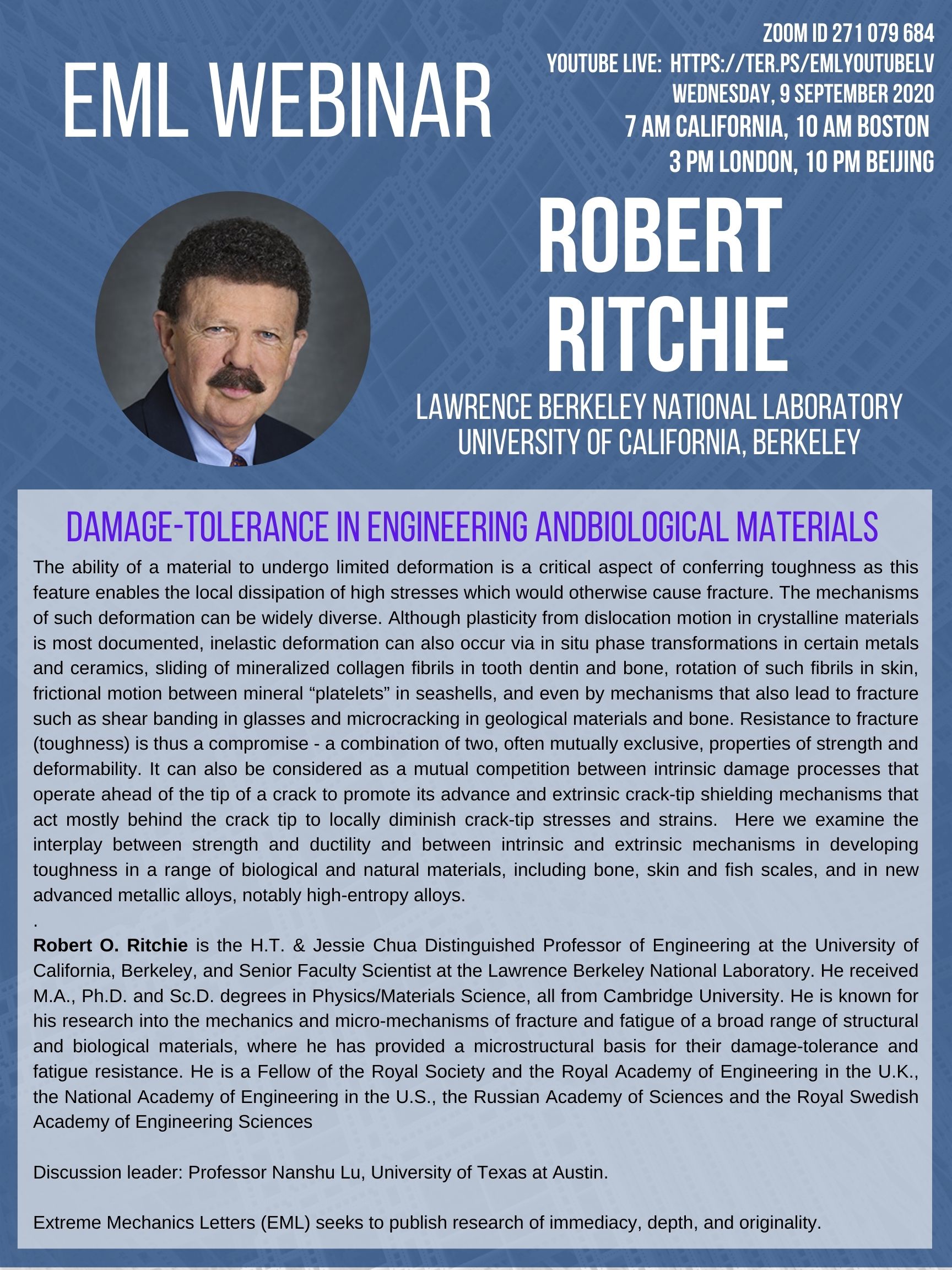 EML Webinar on 9 September 2020 will be given by Prof. Rob Ritchie, University of California, Berkeley, Discussion leader: Nanshu Lu, University of Texas at Austin.