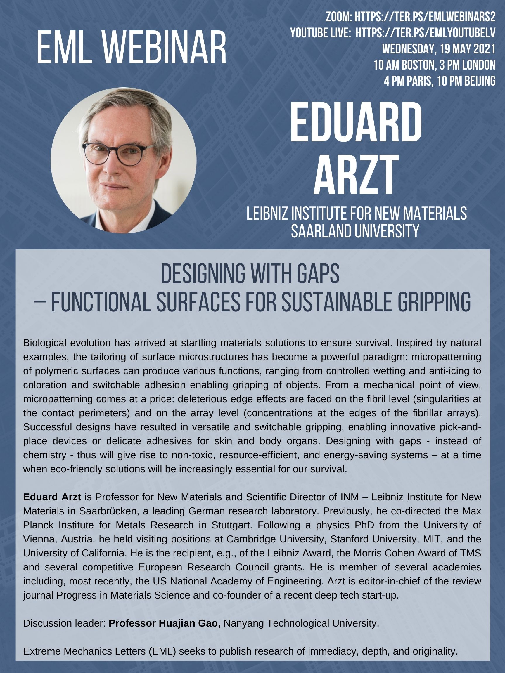 EML Webinar (Season 2) on 19 May 2021 will be given by Eduard Arzt, Saarland University. Designing with gaps – functional surfaces for sustainable gripping. Discussion Leaders: Huajian Gao, Nanyang Technological University
