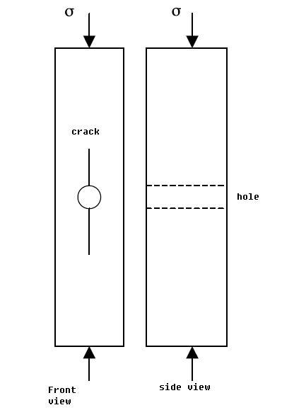 Double cleavage drilled compression (DCDC) specimen is widely used for fracture toughness measurment of brittle materials. As shown in attached figure, the DCDC specimen is rectangular in cross-section with a circular hole drilled through the center. In compression, at some critical stress level, symmetrical cracks will initiate and develop in opposite directions along the mid-plane of the specimen. The mode I stress intensity factor in DCDC specimens is a function of crack length besides other factors, therefore requires the measurement of crack length in the loading process, usually by optical observation of the crack front. I wonder if there is any other way to measure the crack length, for example by measuring structure compliance with a partial unloading, or electric method. Any suggestions will be appreciated.