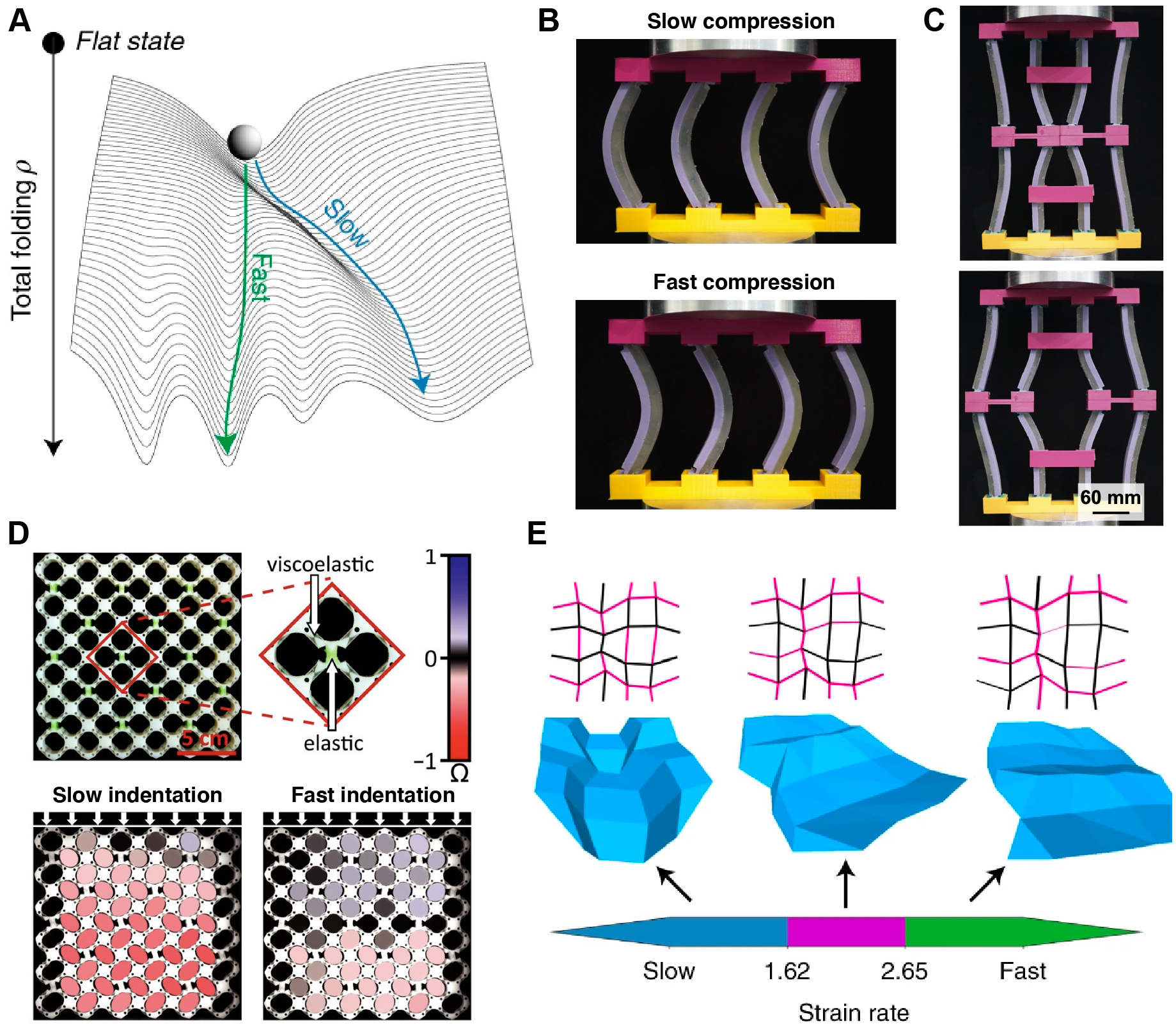 (Fig. 2A). As such, the deformation pathways and ensuing shape-changes and effective properties of the metamaterials can depend dramatically on whether the metamaterials are loaded fast or slow.