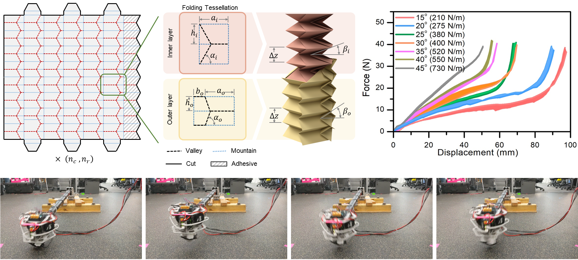 Figure 1. Top right: Sample origami tessellation from [18], [19], where changing the alpha parameter in the fold pattern affects the beta parameter of the folded state. Top right: force-displacement curves under changing beta parameters. Bottom: Demonstrations of the fold pattern as applied to a hopping robot requiring energy storage up to 1.23 J.