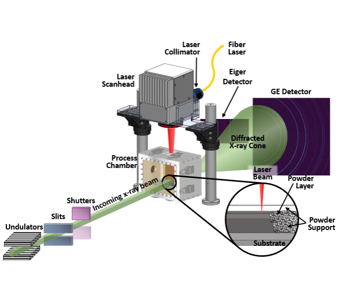 Figure 1: Schematic of custom AM setup integrated at Cornell High Energy Synchrotron Source (CHESS). The setup includes an optical component (laser collimator, fiber laser, and scanhead), a process chamber in which the powder and substrate are laid out, and an incoming x-ray beam controlled by undulators, slits, and shutters. On the other side of the incoming x-ray beam, detectors can be positioned as desired; in the schematic, two detectors were placed (a CdTe Eiger 500k area detector and a far-field GE 51-RT+ area detector), which took measurements at 100 Hz and 4 Hz, respectively.