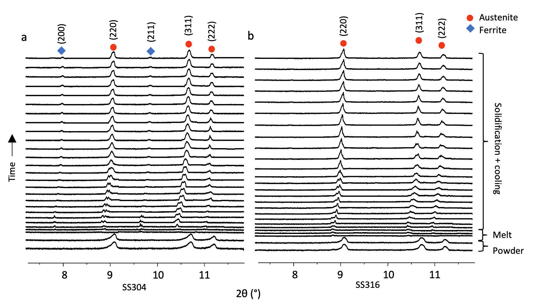 Figure 2: (a,b) stacked 1-dimensional X-ray diffraction (XRD) plots integrated along the azimuth for SS304 and SS316, respectively. As time goes on, the diffraction pattern changes from powder, melt (amorphous/little to no signal), and solidification and cooling. The apparent decrease in 2θ values for both materials after melting reflects the rise in temperature, with a gradual increase in 2θ as the material cools.