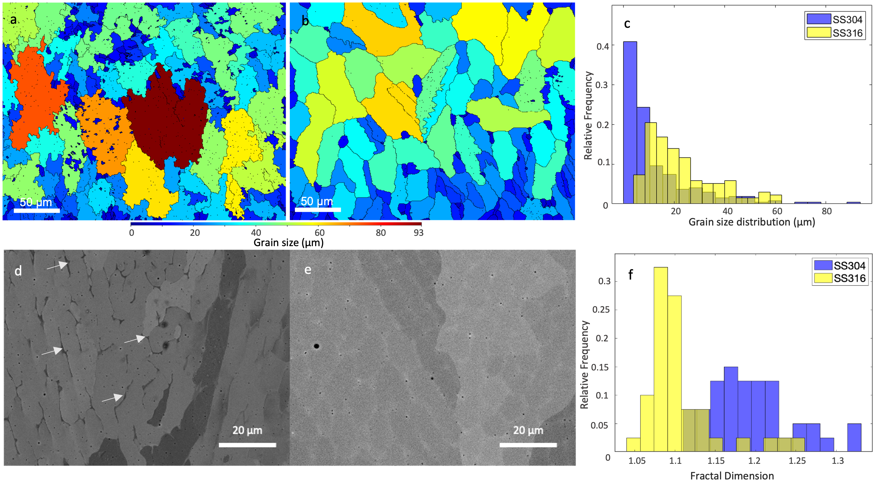 Figure 3: (a,b) Grain size maps of SS304 and SS316, respectively. (c) Histogram of grain size distribution extracted from EBSD. (d,e) Backscatter electron (BSE) images of SS304 and SS316, respectively. Some spots of retained ferrite are indicated by arrows. (f) Histogram of fractal dimensions for grain boundaries of SS304 and SS316.