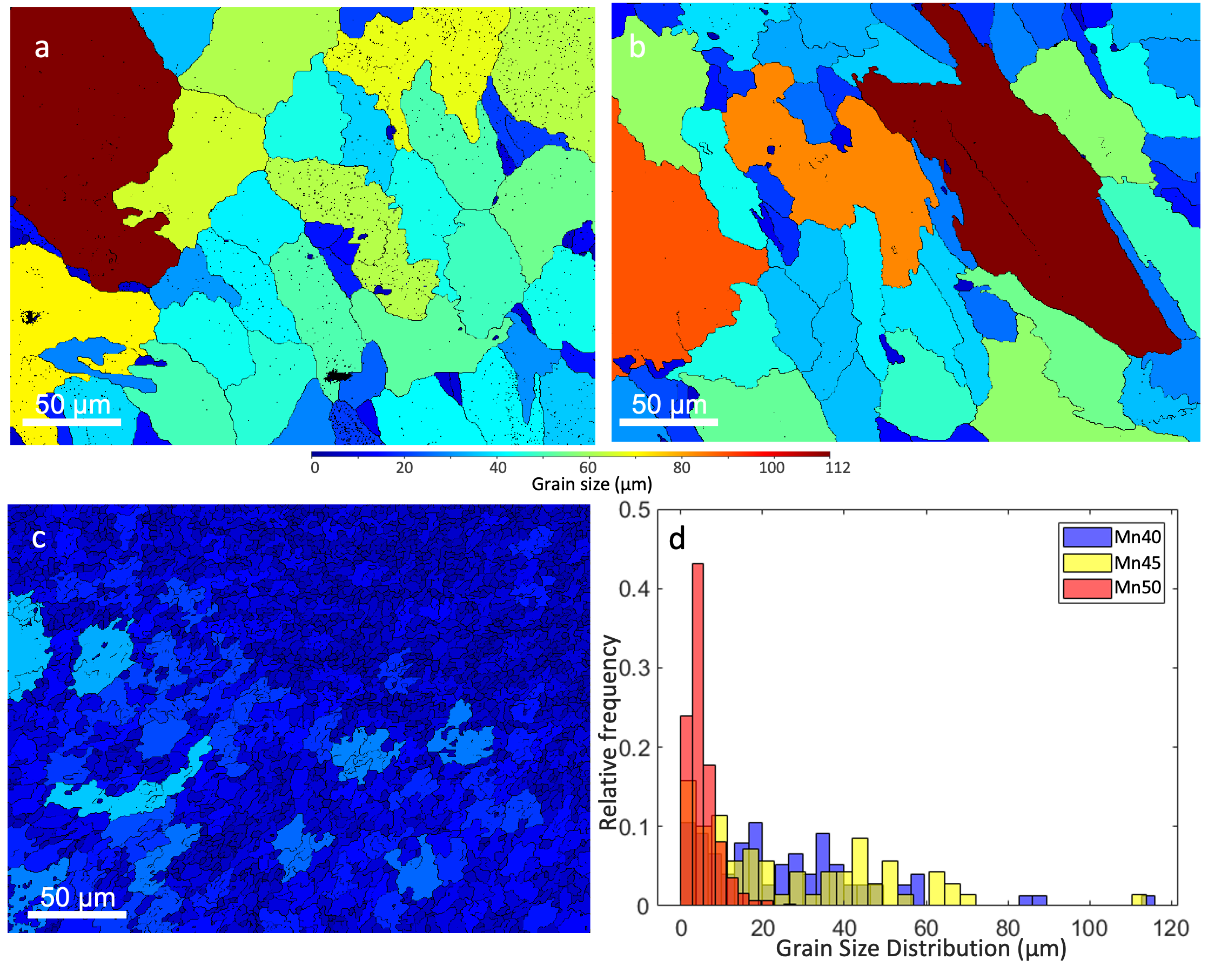 Figure 4: (a-c) Grain size maps of of Mn40, Mn45, and Mn50, respectively. (d) Histogram of grain sizes for Mn40, Mn45, Mn50.