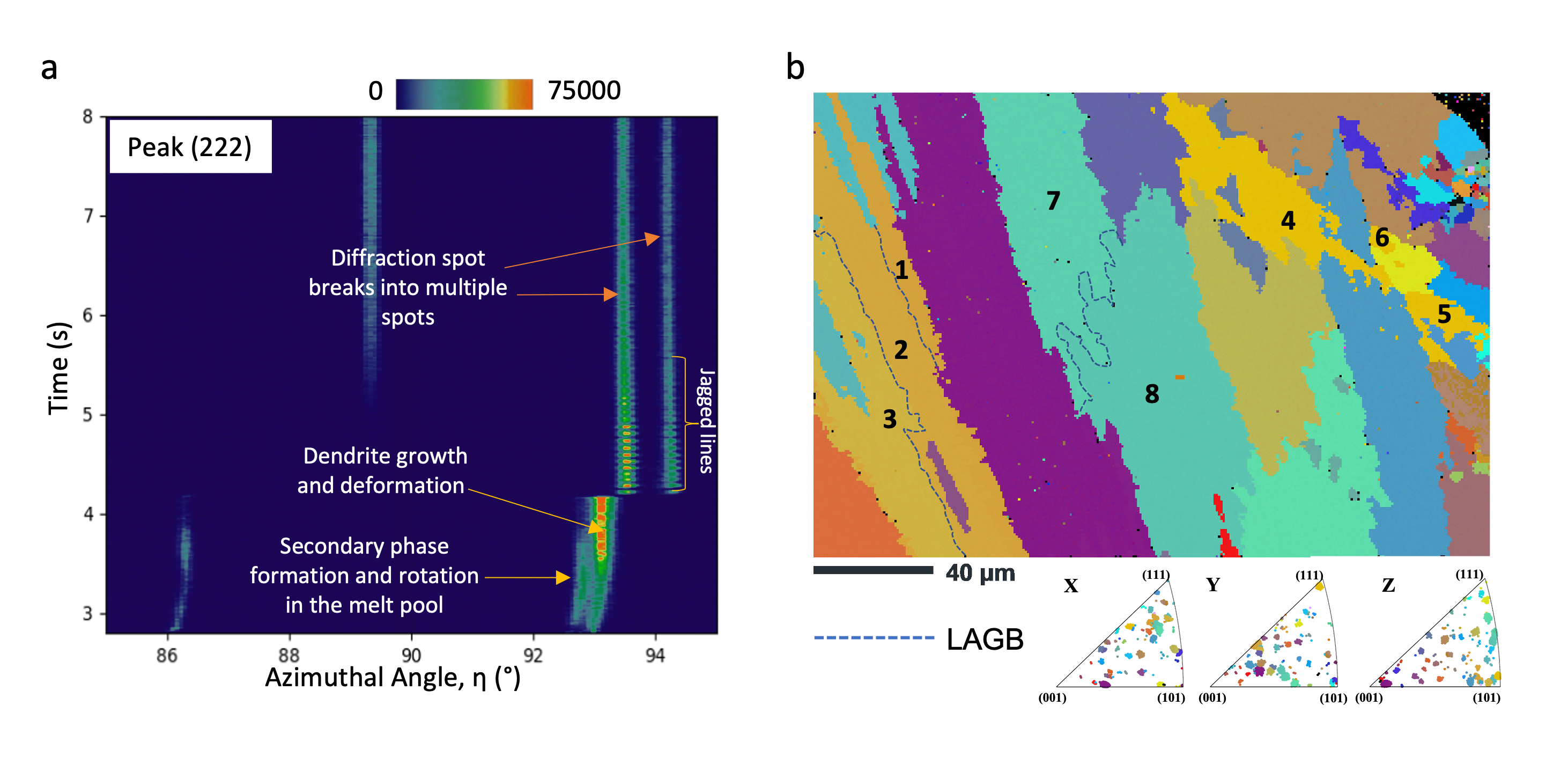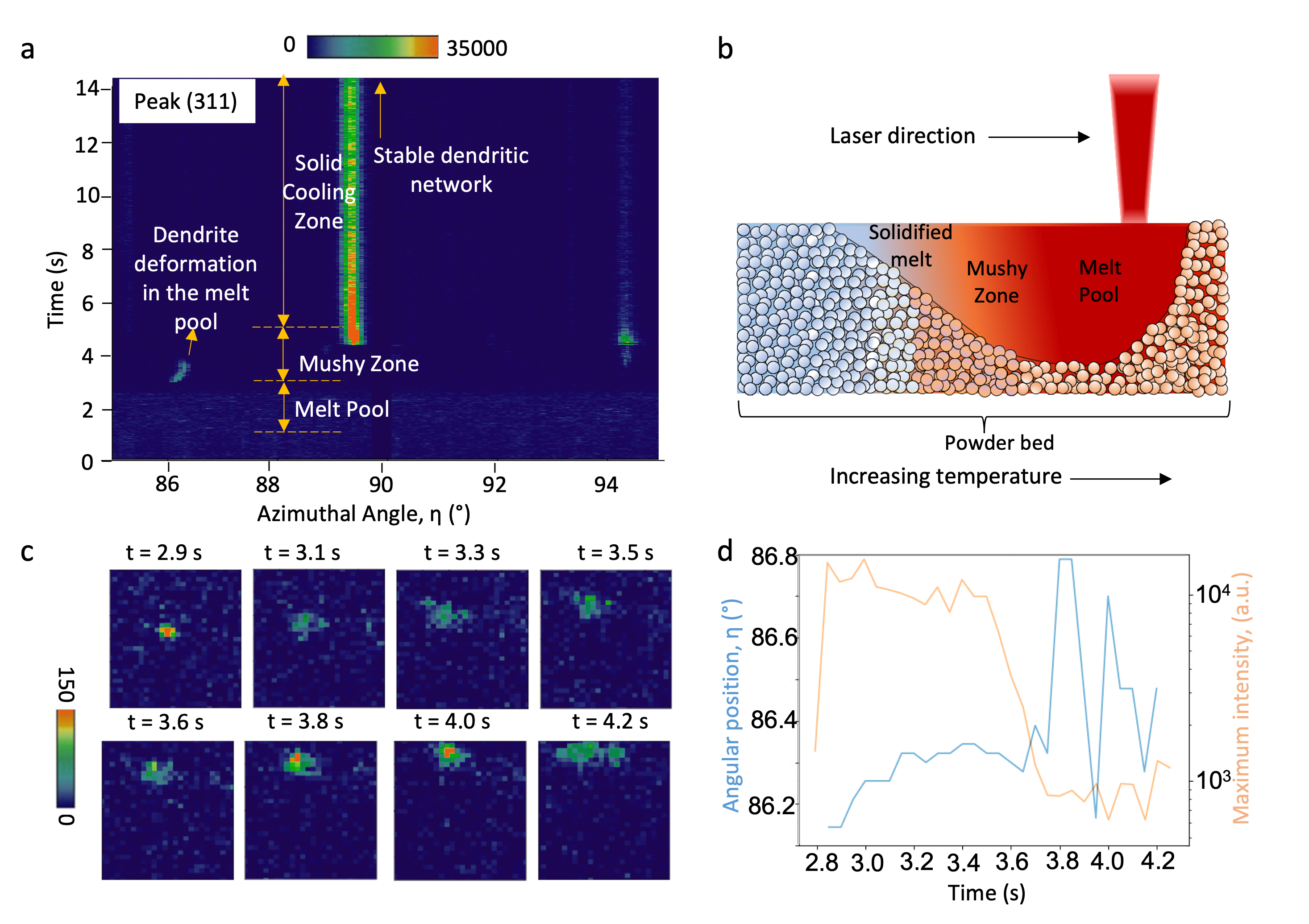 In summary, synchrotron X-ray diffraction is employed to understand the solidification physics and their role on resulting microstructure in steels, high entropy alloys, and nickel-based alloy. Observed phenomena such as solidification pathway and deformation can be correlated to post-mortem characterization of the prints to gain a fundamental understanding of the complex AM process [13-16]. These observations are complementary to many synchrotron imaging not only in PBF and DED systems but also in electron beam melting [17]. With AM being successfully integrated into design and manufacturing of many industries, the demand for high-quality parts production increases. However, several challenges remain in order for AM products to be more widely applied. An example of such challenge is the tradeoff between temporal and spatial resolution inherent to the time-resolved X-ray diffraction experiments. One solution, as discussed in the current post, is to integrate multiple detectors that can achieve either high temporal or spatial resolution to reach a better understanding of the fast-evolving process. Alternately, simultaneous integration of diffraction and imaging can be helpful to gain various information about the process such as solidification front velocity and melt pool dynamics. In addition, the current maximum spatial and temporal resolution attainable on in-situ XRD is still a few orders of magnitude too low to probe the fast dynamics of PBF (10^6-10^8 K/s); thus, improvements on beamline and detector characteristics are necessary by increasing brilliance and beam flux. These upgrades would enable the investigation of defect formation, stress evolution, and phase transformation kinetics in various processing conditions. In addition, operando small angle x-ray scattering (SAXS) during AM is a promising technique that could give us critical insights into the early stages of solidification. All in all, reaching a fundamental understanding of the physical mechanisms will aid in tackling the common issue in AM of texture evolution, defect formation and cracking during solidification. Ultimately, these findings can be leveraged to design specific microstructures with targeted properties. After gaining a comprehensive understanding of the research findings, it is necessary to establish correlations that can be applied in industrial settings for broader adoption and translation of the research.