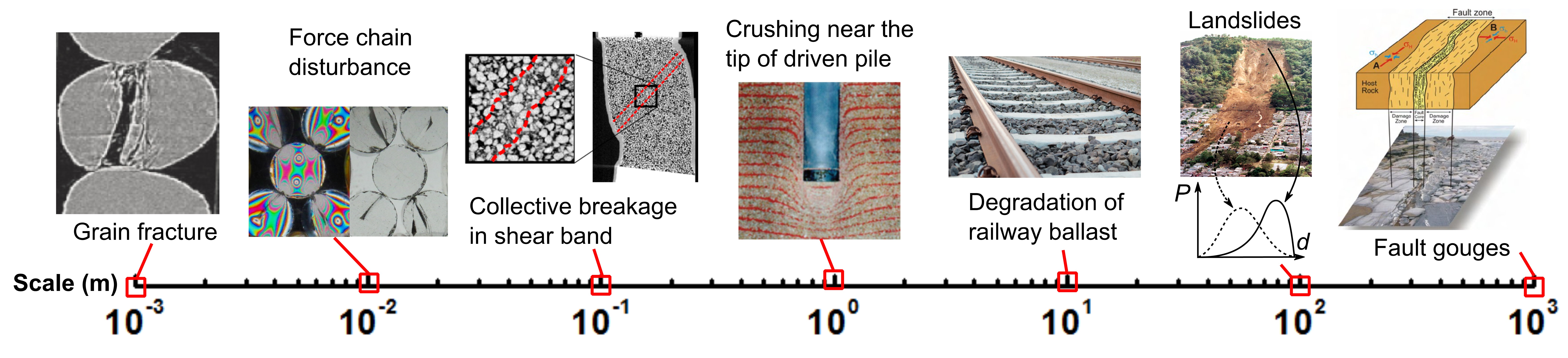 The grain size distribution (GSD) of natural soil is constantly evolving due to crushing, agglomeration, mixing, and segregation (Foley, 2018; Johnson et al., 2012; Wang et al., 2002). Understanding the grain size dynamics during these processes is of great engineering and scientific significances. In geotechnical engineering, grain size distribution provides the main indices characterizing and classifying sands. It has first-order impacts on the shear strength, deformability, hydraulic conductivity, and erodibility of granular soils (Kenney and Lau, 1985; Singh et al., 2021; Wood and Maeda, 2008; Yang and Gu, 2013). In geoscience, grain size distribution encodes the history of earth's or other planets' surface (Anderson and Bunas, 1993; McKay et al., 1974). Each process of crushing, agglomeration, mixing, and segregation drive a different mode of GSD evolution, and thus difficult to identify universal trends if they are discussed altogether. Herein, this article will focus on the grain size evolution dominated by grain crushing, usually under high stress situations that can be seen at many length scales (Fig. 4).