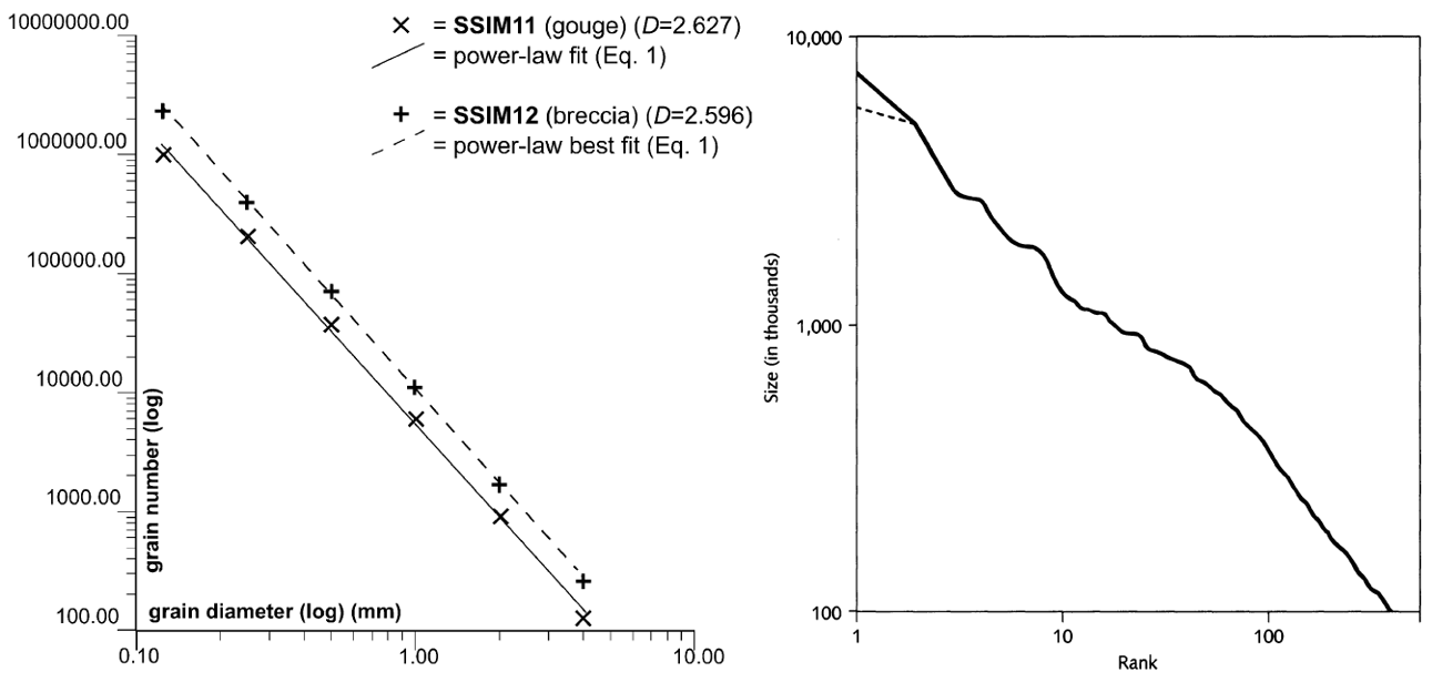 Figure 5: Left: GSD of gouge and breccia materials collected from the Mattinata fault (Billi, 2005). Right: Number of cities in which the population exceeds a given size or, equivalently, the relative ranking of cities vs. their population around year 1920 (Bak, 2013; Zipf, 2016).