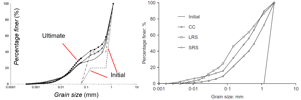 Figure 6: Left: Gap-graded soils do not exhibit a mono-fractal GSD after crushing (Zhang et al., 2017). Right: samples stressed under oedometric compression and ring shear tests develop different ultimate GSDs (Miao and Airey, 2013).